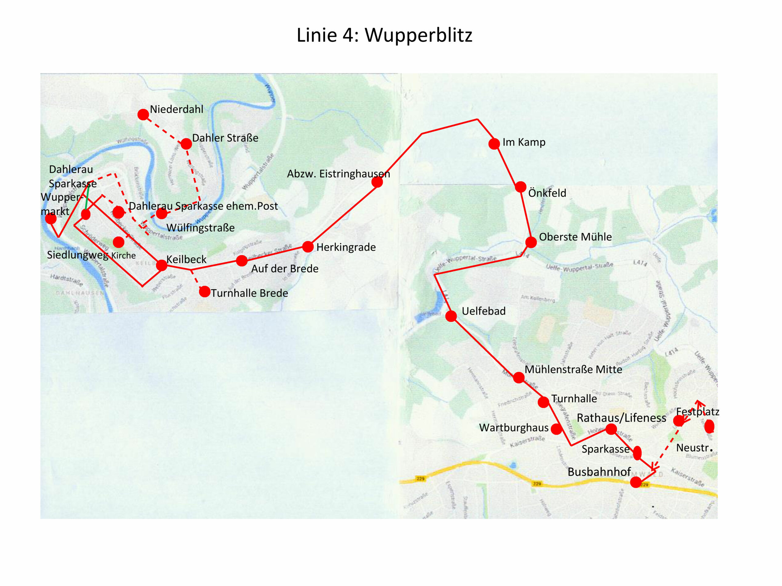„Wupper-Blitz“: Busbahnhof – Önkfeld – Herkingrade – Keilbeck – Niederdahl – Wuppermarkt – Niederdahl und zurück zum Busbahnhof