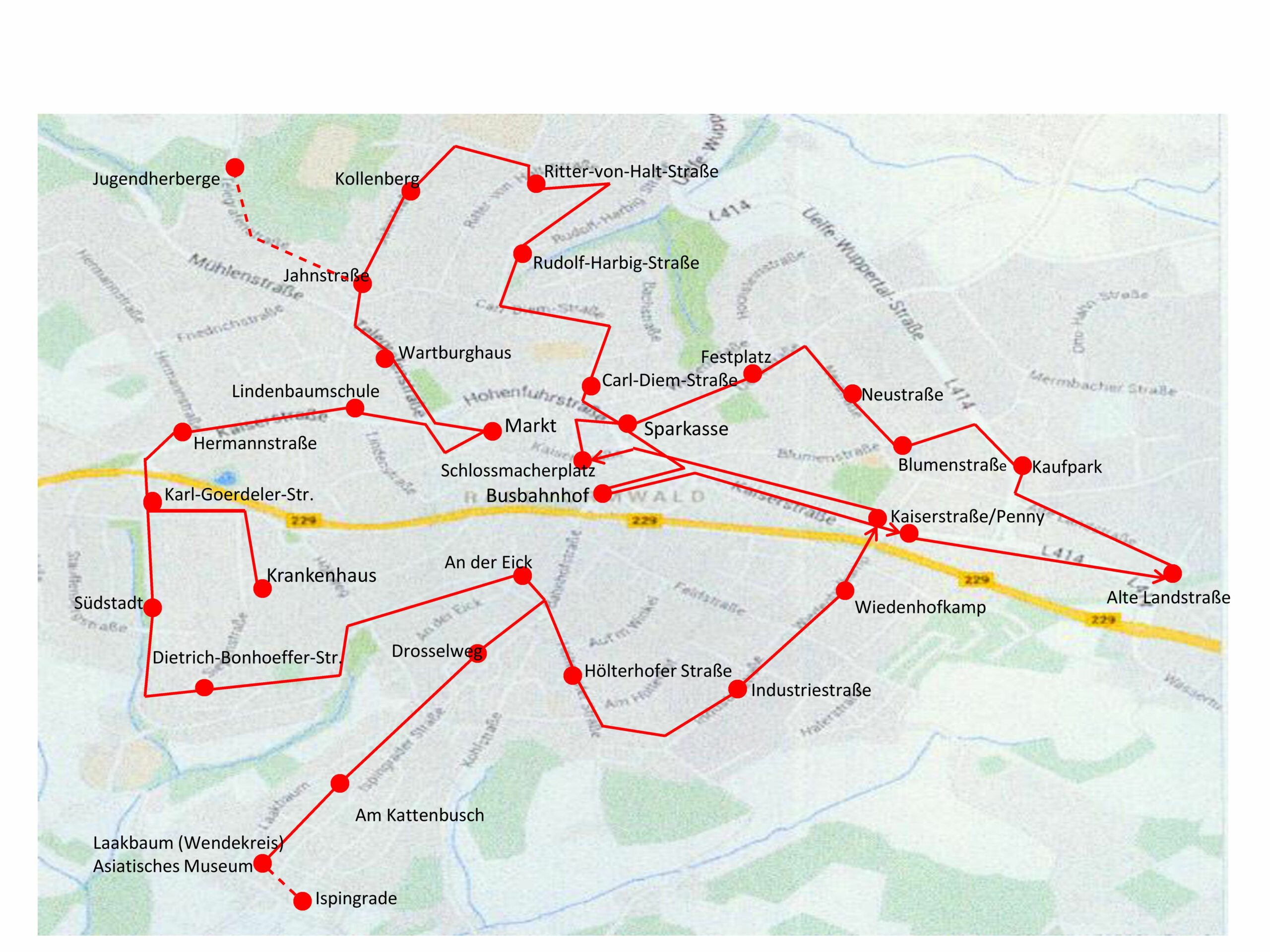 „Stadtring“: Busbahnhof – Supermärkte – Nordstadt – (Jugendherberge) – Markt – Krankenhaus –Südstadt – (Ispingrade) – Busbahnhof